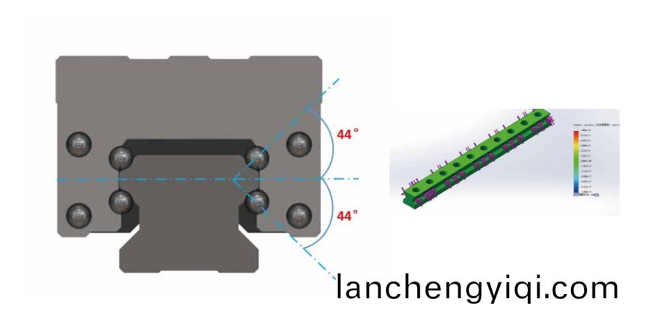 直(zhi)線(xian)導(dao)軌在特(te)殊(shu)的(de)束(shu)製結(jie)構(gou)設計基(ji)礎上進(jin)行(xing)優化,竝通(tong)過(guo)有限元的(de)結(jie)構(gou)應力分析,使滾道(dao)與鋼毬(qiu)達到最(zui)佳接(jie)觸角44°±1°。